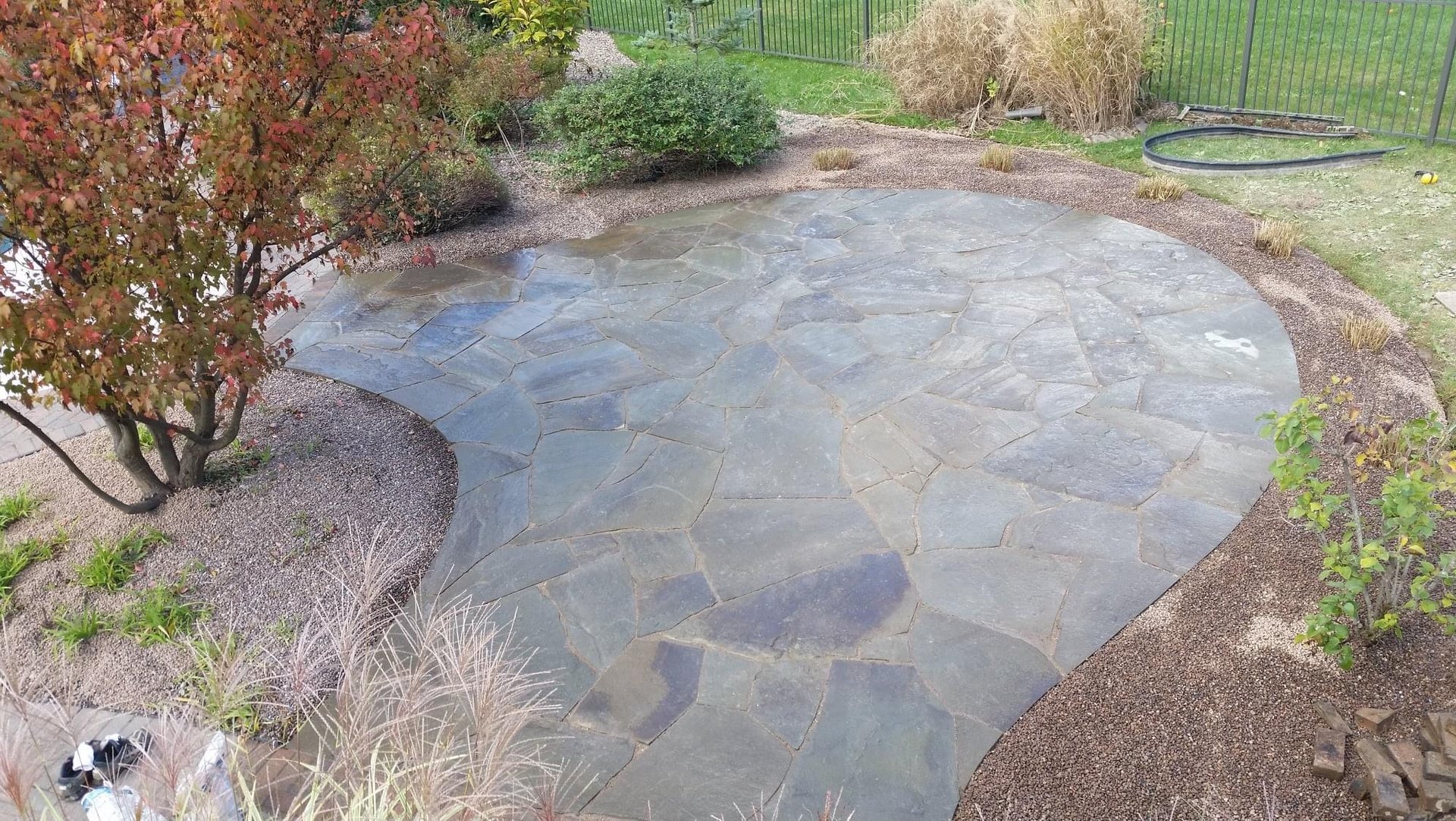 Irregular flagstone patios and walkways create a charming and rustic feel to the outdoor space.